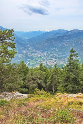 Nei pressi del Col de Joux, sul sentiero per il Colle di Zuccore, panorama sulla Val d'Aosta: in fondo valle Saint Vincent, sul fondo appare il Monte Bianco.