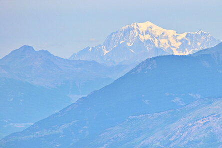 Nei pressi del Col de Joux, sul sentiero per il Colle di Zuccore, panorama Monte Bianco (fotografia con zoom).