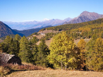 Panorama dalla frazione Prabarmaso: sul fondo il Monte Bianco, in basso Estoul a sinistra il monte Zerbion.