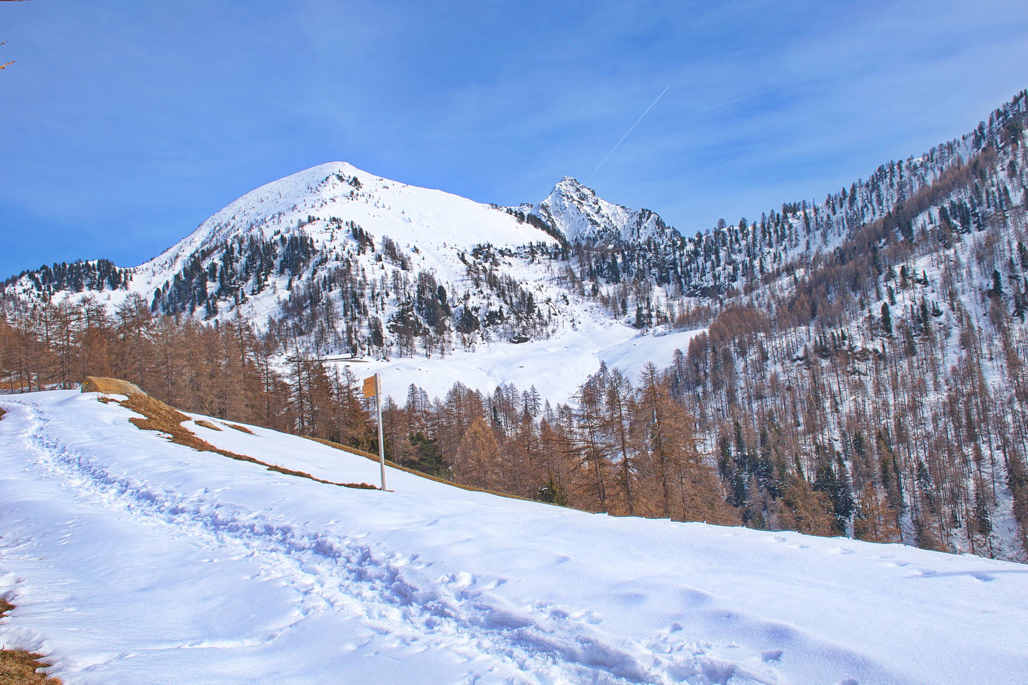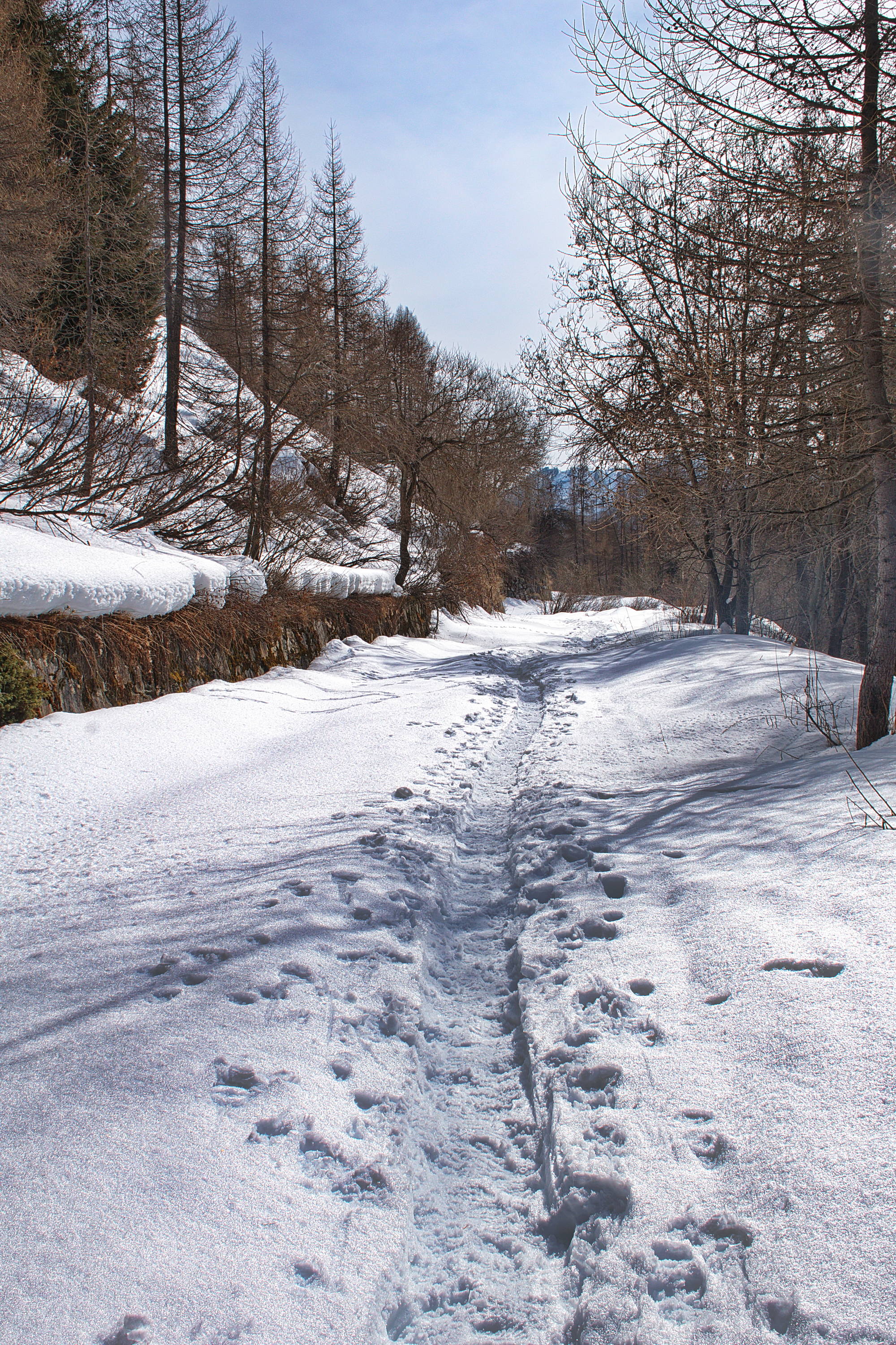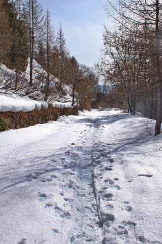 La strada, salendo è innevata: senza racchette da neve (ciaspole) si cammina un po' faticosamente.