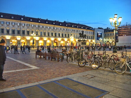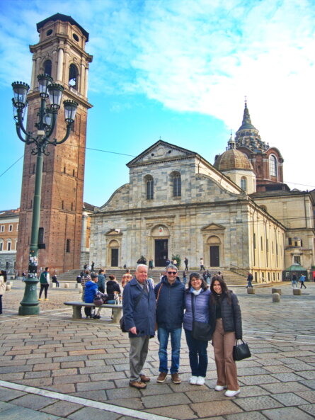 Con gli amici Bruno, Sandra e Raffaella davanti al Duomo di Torino.