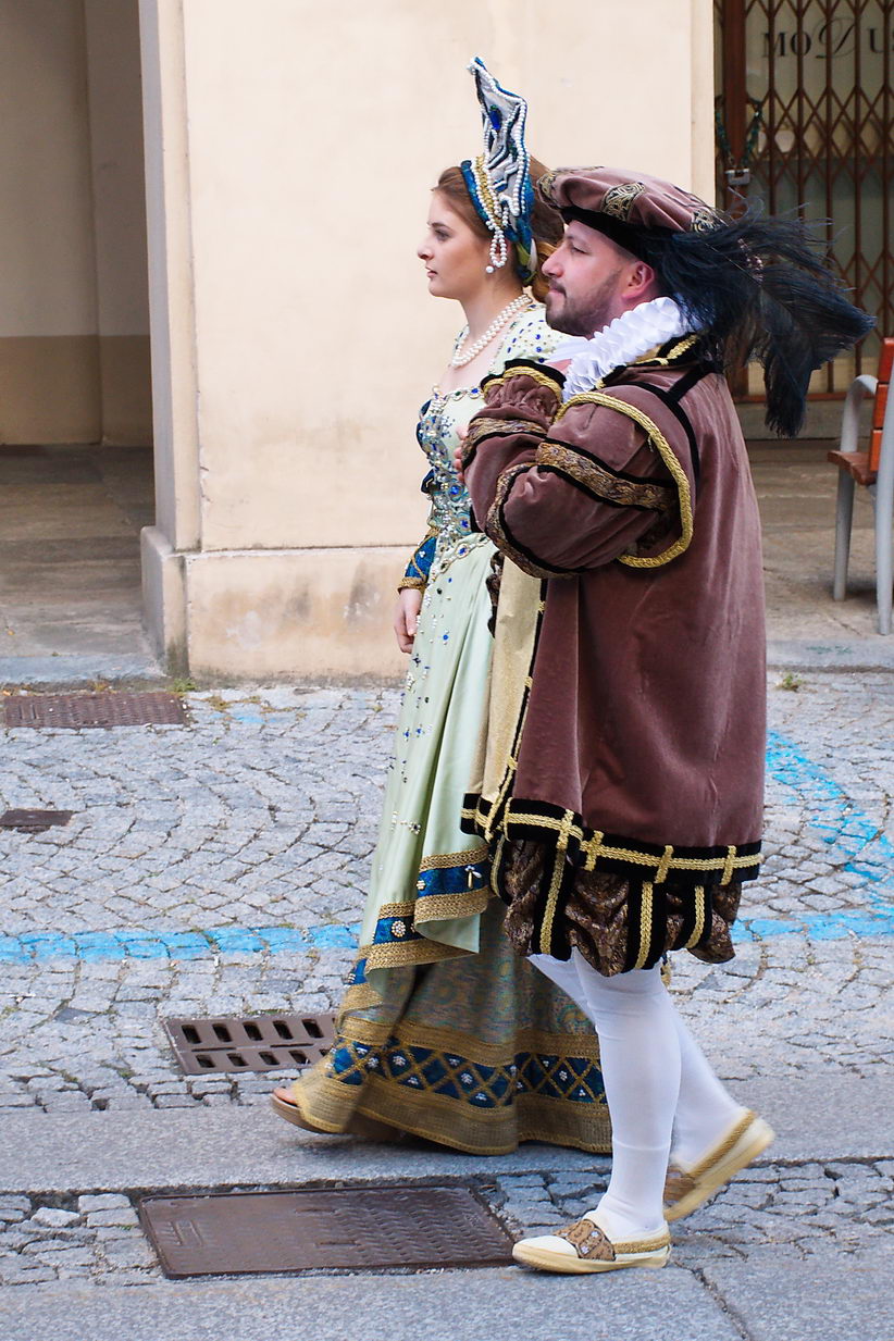 Fossano (CN): il Palio dei Borghi, figuranti si dirigono al Castello degli Acaia dove si svolgerà la manifestazione.