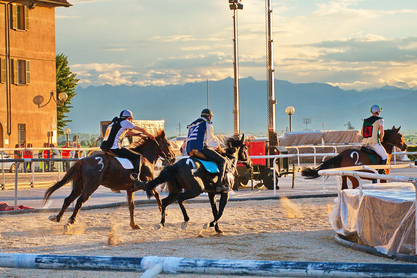 Fossano (CN): il palio, cavalli dopo la curva delle tribune.
